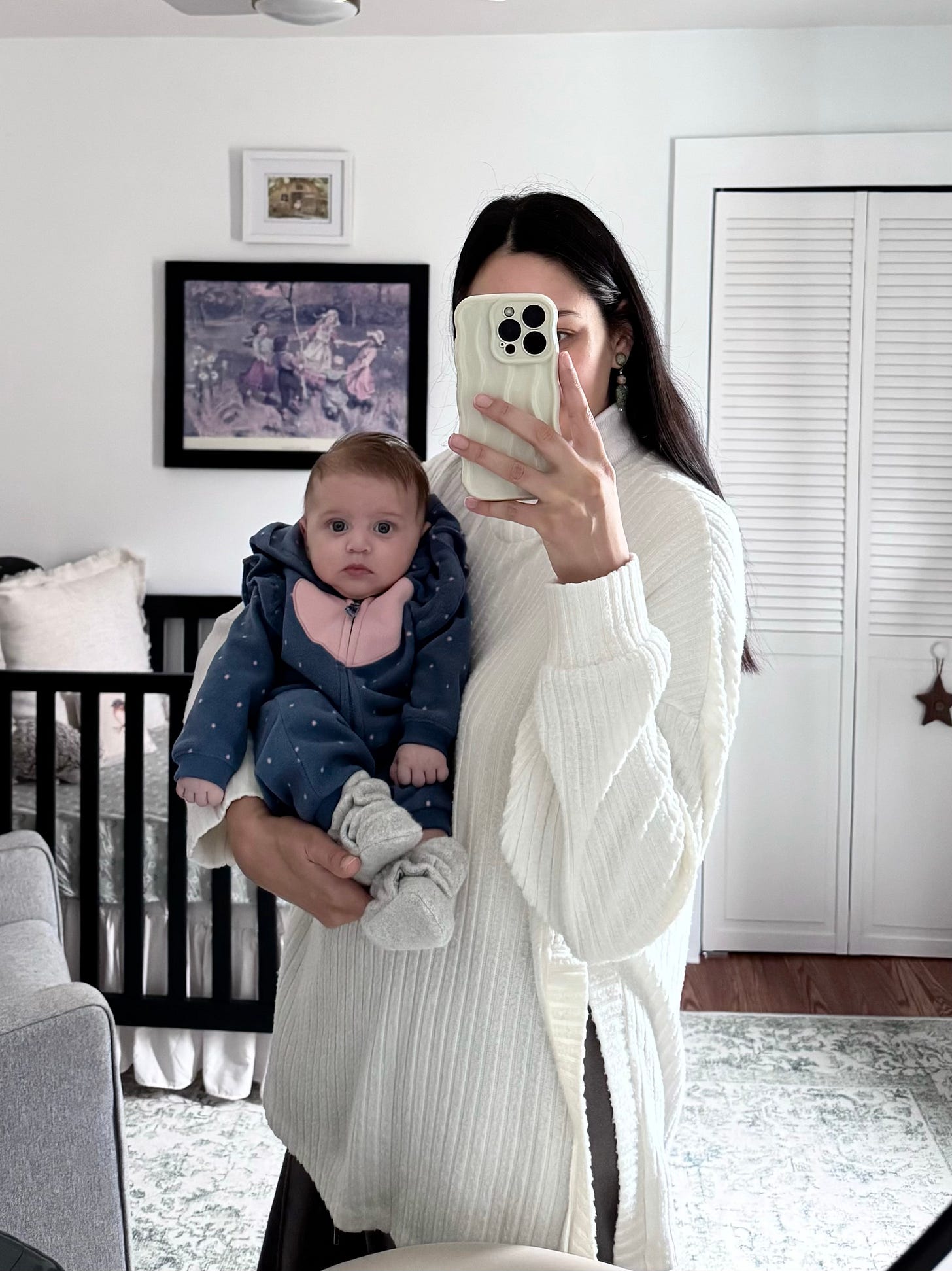 The baby’s day with me is a rotating symphony of eating, playing, and then napping in her crib in the nursery, a first for us. Some of my favorite moments happen in the morning as she watches me from her bedside bassinet, her small, round face searching mine. Her big smiles and happy babbles are treasured keepsakes that I tuck away in my pockets.